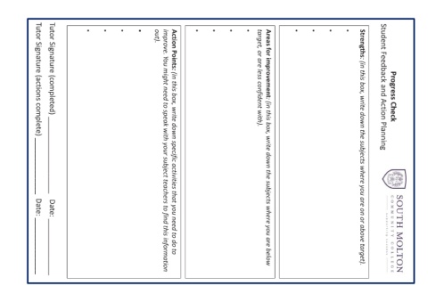 My Progress Check Tutor Signature (actions complete) ______________ Date: ______________ Tutor Signature (completed) ___________________ Date: ______________ • • • • out). improve. You might need to speak with your subject teachers to find this information Action Points: (in this box, write down specific activities that you need to do to • • • • target, or are less confident with). Areas for improvement: (in this box, write down the subjects where you are below • • • • Strengths: (in this box, write down the subjects where you are on or above target). Student Feedback and Action Planning Progress Check