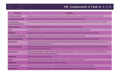 Conditioned practices Practice games where the rules of a sport are changed to focus on specific skills. feedback Information given to a participant about their performance. Feedback can be constructive or positive.