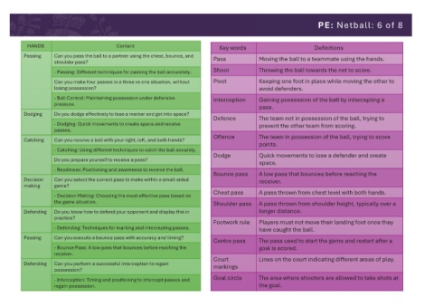 - Passing: Different techniques for passing the ball accurately. Shoot Throwing the ball towards the net to score.
