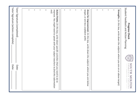 My Progress Check Tutor Signature (actions complete) ______________ Date: ______________ Tutor Signature (completed) ___________________ Date: ______________ • • • • out). improve. You might need to speak with your subject teachers to find this information Action Points: (in this box, write down specific activities that you need to do to • • • • target, or are less confident with). Areas for improvement: (in this box, write down the subjects where you are below • • • • Strengths: (in this box, write down the subjects where you are on or above target). Student Feedback and Action Planning Progress Check