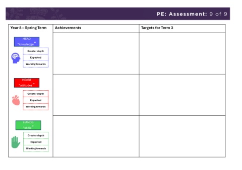 PE: Assessment: 9 of 9 Year 8 – Spring Term Achievements Targets for Term 3 HEAD “knowledge” Greater depth Expected Working towards HEART “attitudes” Greater depth Expected Working towards HANDS “skills” Greater depth Expected Working towards